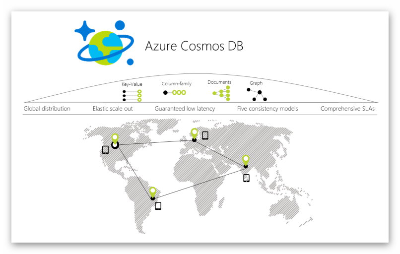 Als Nachfolger der Document-DB ist die Azure Cosmos DB einer der neuesten Azure Services. Hauptmerkmale der Cosmos DB sind die hohe Verfügbarkeit und weltweite Skalierbarkeit bei Unterstützung von verschiedenen Datenmodellen. Es werden verschiedene Leistungsmerkmale wie Antwortzeiten, Verfügbarkeit, Durchsatz und Konsistenz via SLAs garantiert. Die Leistungsfähigkeit wird durch eine einfach zu erstellende, globale und redundante Verteilung der Daten erreicht, wobei eine Azure-Region als Schreibspeicher definiert wird und beliebig viele andere Regionen als Lesespeicher.
