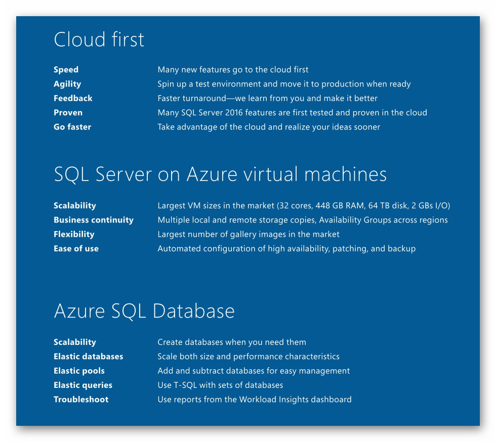 Sozusagen die „klassische“ relationale SQL-Server Datenbank, nur eben „ohne“ Server sondern als Service in Azure bereitgestellt. Mit allen Vor- und Nachteilen einer Cloud-Datenbank im Vergleich zu On-Premise. Skalierbar in detaillierten Stufen in Leistung und Größe, relativ preisgünstig und aufgesetzt in Minuten: „Stell Dir vor, es ist Datenbank und keiner installiert!“